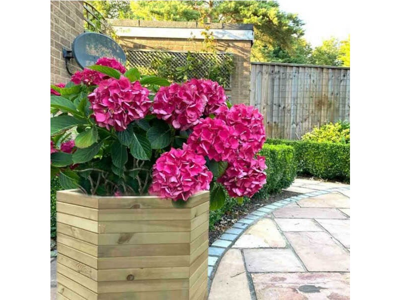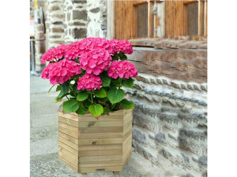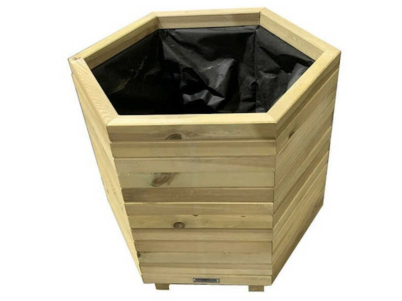 Ξύλινη Γλάστρα Εξάγωνη Εξάγωνη 56(Υ)xΦ65cm με Γωνίες Εσωτερικές - Εμποτισμένες Εξάγωνες Ξύλινες Γλάστρες. Η εξάγωνη ξύλινη γλάστρα κατασκευάζεται εξ ολοκλήρου από εμποτισμένο τετραγωνικής διατομής ξύλο. Διαθέτει μεμβράνη εσωτερικά η οποία συγκρατεί το εδαφικό μίγμα αλλά επιτρέπει την απορροή των πλεοναζόντων υδάτων έτσι ώστε να κυκλοφορεί ανεμπόδιστα ο αέρας στο φυτευτικό μέσο. Είναι κατάλληλη για την φύτευση μέσης ανάπτυξης ανθοφύτων, θάμνων και αρωματικών. Παρέχεται άβαφη, στην φυσική απόχρωση του ξύλου, ωστόσο υπάρχει η δυνατότητα βαφής στο επιθυμητό χρώμα κατόπιν συνεννόησης. Η ξυλεία προέρχεται πιστοποιημένα από οργανωμένη υλοτόμηση Σκανδιναβικών δασών με γνώμονα την αειφορία, ο δε εμποτισμός του ξύλου πραγματοποιείται με την μέθοδο Tanalith. Η επεξεργασία του ξύλου με την μέθοδο Tanalith, τελείται υπό πίεση που διασφαλίζει ότι οι ουσίες που εμπεριέχονται στο χημικό μείγμα απορροφώνται βαθιά μέσα στο ξύλο. Η επεξεργασμένη υπό πίεση ξυλεία είναι πολύ πιο ανθεκτική στην σήψη, την μούχλα, τους μύκητες, τα έντομα και τις ακραίες καιρικές συνθήκες.