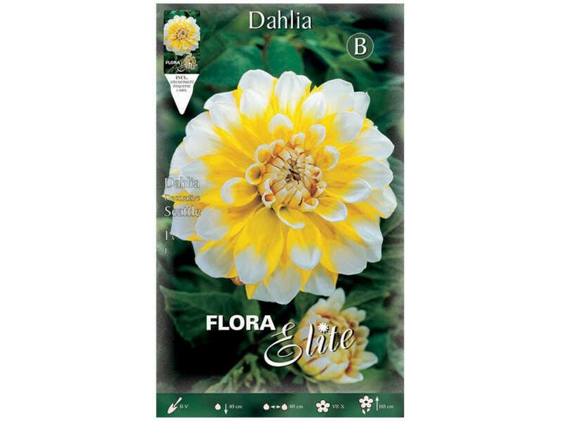 Ντάλια Seattle Δίχρωμη Υβρίδιο Λευκό-Κίτρινο: κoνδυλώδης ρίζα δίχρωμης Ντάλιας με λευκό εξωτερικά και κίτρινο εσωτερικά χρώμα μεγάλου άνθους μεγέθους 15 έως 20 εκ. περίπου. Η υβριδική Ντάλια Seattle εισήλθε στην αγορά το 1993 από τον Ολλανδικό οίκο Verwer. Είναι κονδυλλόριζο φυλλοβόλο πολυετές φυτό, θαμνώδους εμφάνισης και ανοιξιάτικης φύτευσης, το ύψος του οποίου μπορεί να φτάσει τα 0,90 έως 1,10 m. Οι Ντάλιες ανθοφορούν περίπου 10 με 12 εβδομάδες μετά την φύτευσή τους, με μεγάλου μεγέθους και εντυπωσιακών χρωμάτων άνθη, η δε ανθοφορία τους ξεκινά στις αρχές του καλοκαιριού και διαρκεί μέχρι και το φθινόπωρο. Οι κoνδυλώδεις ρίζες της Ντάλιας μπορούν να φυτευτούν στον κήπο ή σε γλάστρα και ζαρντινιέρα. Για την φύτευση σε γλάστρες και ζαρντινιέρες απαιτείται υψηλής ποιότητας εδαφικό μείγμα, καθώς και ελαφρόπετρα ή άλλο παρεμφερές υλικό, στην περιοχή του πάτου, για διευκόλυνση της στράγγισης, η οποία στην περίπτωση των κονδυλόρριζων φυτών πρέπει να είναι άριστη.