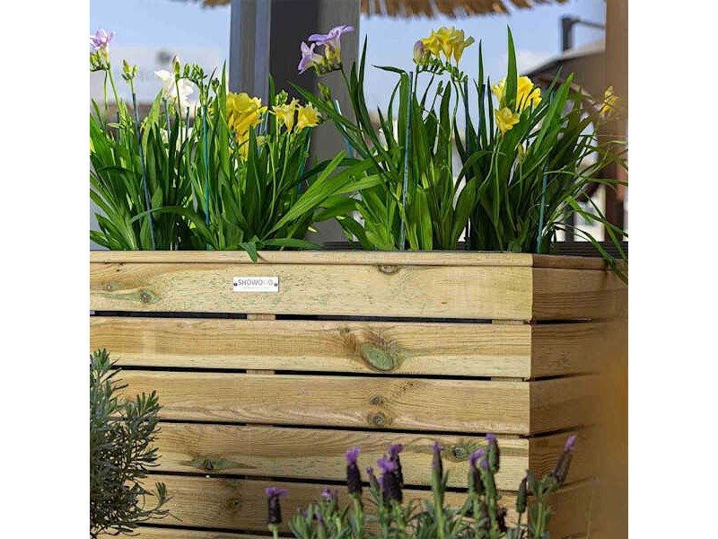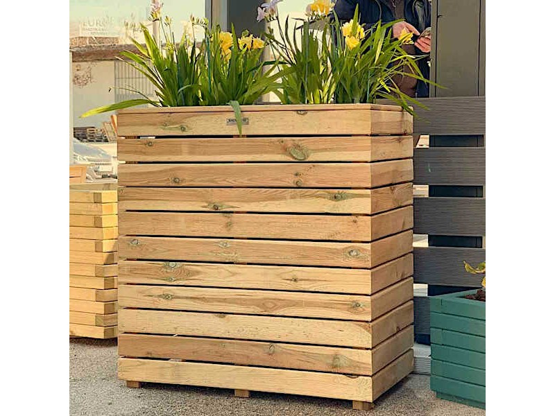 Wooden Planter 2 Cachepot 85(H)x43x80cm - Wooden Pots & Planters. The wooden planter are made entirely of square cross section impregnated wood. It has 2 sites for cachepot (included) with handles which can be moved if necessary. Cachepot hold the soil mixture and water, if this is desired, otherwise, by creating holes, they drain like any planter with holes. The planter is provided unpainted, in the natural shade of the wood, however there is the possibility of painting in the desired color after consultation. The wood comes certified from organized logging of Scandinavian forests with a view to sustainability, and the impregnation of the wood is carried out using the Tanalith method. The treatment of wood with the Tanalith method is done under pressure which ensures that the substances contained in the chemical mixture are absorbed deep into the wood. Pressure treated timber is much more resistant to rot, mold, fungus, insects and extreme weather.