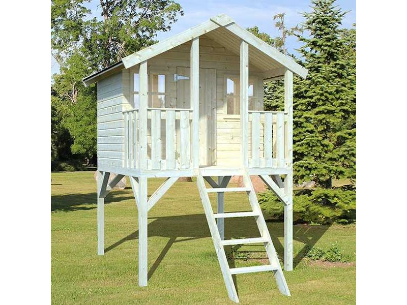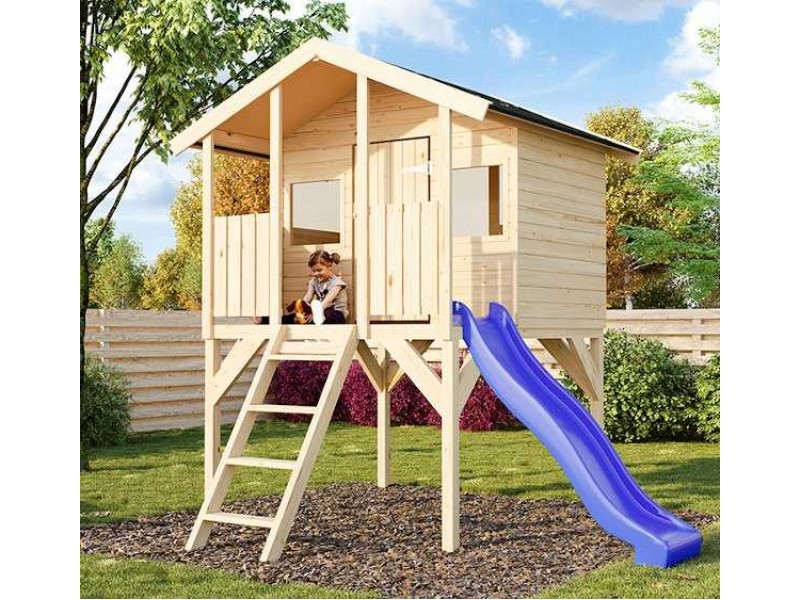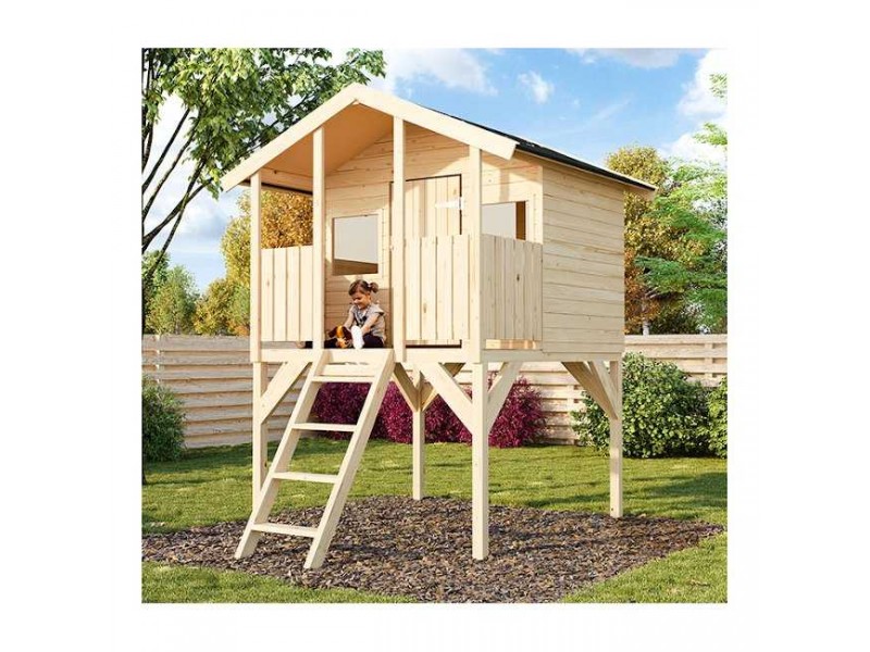 Wooden Playhouse TOBY 180x120cm. The Wooden Playhouse TOBY will be a attraction for young children and their friends for many years, offering them play, entertainment, and the development of their imagination and sociality. The playhouse is made of raw Scandinavian fir wood so that it can be easily painted in the children's favorite colors. It has two windows and a large front area that acts as a balcony protected by a fence, with its interior completely paved and the roof sloping. The Wooden Playhouse TOBY is spacious and cozy and can be placed in the residential garden or any similar outdoor space for urban or country living.