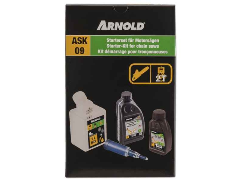 ARNOLD Αρχικό Σετ για Αλυσοπρίονα Πλήρες. Το Σετ Πρώτης Χρήσης για Αλυσοπρίονα ARNOLD παρέχει όλα τα απαραίτητα υλικά για τη σωστή αρχική εκκίνηση, συντήρηση και λειτουργία του αλυσοπρίονου σας. Το σετ περιλαμβάνει ένα μπουκάλι 250 ml 2-χρονου λαδιού για μίξη με καύσιμο, το οποίο εξασφαλίζει τη σωστή λίπανση και απόδοση του κινητήρα. Επιπλέον, περιλαμβάνεται ένα δοχείο ανάμειξης για 2-χρονο καύσιμο, το οποίο διευκολύνει την ακριβή ανάμειξη του λαδιού με τη βενζίνη. Για τη λίπανση της αλυσίδας, το σετ περιλαμβάνει ένα μπουκάλι λάδι αλυσίδας 1000 ml, το οποίο μειώνει την τριβή και προστατεύει την αλυσίδα από τη φθορά. Τέλος, το σετ περιέχει έναν γρασσαδόρο για τη λάμα της αλυσίδας, ο οποίος διασφαλίζει την ομαλή και απρόσκοπτη κίνηση της αλυσίδας κατά το κόψιμο. Η ολοκληρωμένη φύση αυτού του σετ το καθιστά απαραίτητο για όσους θέλουν να διατηρήσουν το αλυσοπρίονό τους σε άριστη κατάσταση λειτουργίας και να παρατείνουν τη διάρκεια ζωής του.