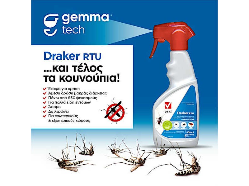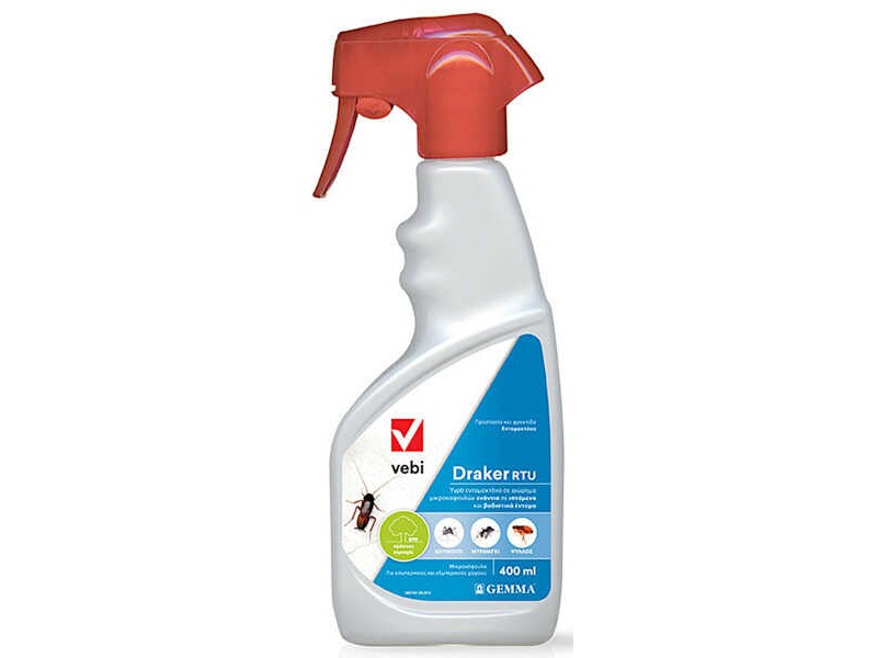 Draker RTU 400ml Υγρό Εντομοκτόνο & Ακαρεοκτόνο. Το DRAKER RTU είναι ένα υγρό εντομοκτόνο-ακαρεοκτόνο, μακράς διαρκείας, ευρέος φάσματος και έτοιμο προς χρήση. Είναι αποτελεσματικό στον έλεγχο των ιπτάμενων εντόμων όπως και πολλών βαδιστικών εντόμων (κουνούπια, κουνούπια τίγρης, μύγες, φλεβοτόμοι, μυρμήγκια, κατσαρίδες, ψύλλοι, ακάρεα, βρωμούσες κ.α.). Το DRAKER RTU εξουδετερώνει τα έντομα που υπάρχουν κατά τον χρόνο εφαρμογής και αποτρέπει την ανάπτυξη μελλοντικών προσβολών για 2-3 εβδομάδες. Ενεργεί άμεσα λόγω της δραστικής ουσίας Tetramethrin που περιέχει και βρίσκεται σε ελεύθερη μορφή. Ταυτόχρονα έχει μεγάλη υπολλειματική διάρκεια χάρις στην δράση ακόμα ενός συστατικού, της ουσίας Cypermethrin. Το δραστικό συστατικό Cypermethrin περιέχεται σε μορφή μικροκάψουλας, η οποία παράγεται με βάση το νερό και όχι το πετρέλαιο, καθιστώντας το Draker όχι μόνο ένα υψηλής αποτελεσματικότητας βιοκτόνο, αλλά και ένα υγιονομικής σημασίας προϊόν που εφαρμοζόμενο δεν λερώνει.