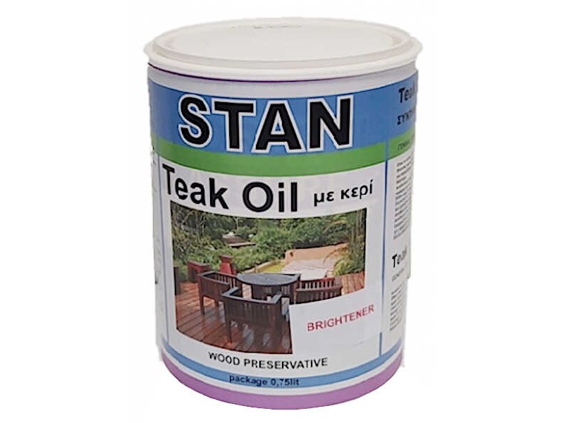 Stan Teak Oil Brightener Water with Wax 750ml - Preservatives & Wood Varnishes. High quality preservative oil for Teak wood and hard, exotic woods, from the Greek company CPI DOM. The Stan Teak Oil offers protection from environmental conditions and weather to many different hardwoods such as teak, mahogany, meradi, iroko, etc. It is a product of special impregnation of the wood with a fine resin texture, which does not stay on the surface areas but it penetrates deeply. In addition, it also has a wax that remains on the surface for even more effectiveness. In this way, the preservative oil "shields" and protects the wood from corrosion, rough handling, salt, moisture and sunlight. Stan Teak Oil Brightener is supplied ready to use and is applied either by brush, roller or spray. It is used in garden furniture, decks and wooden parts of boats, as well as in wooden structures such as pergolas, wooden pots, etc.