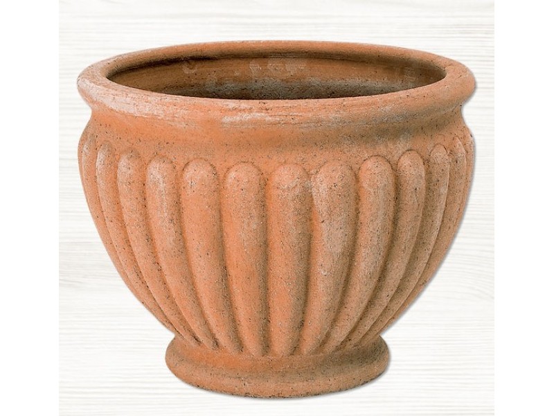 The handmade Round Clay Plant Pot KALLISTI Ø37 x (H)28cm light brown-terracotta color is included in the Series of CRETE terracotta and ceramic machine pots and planters, manufactured by the leading Greek company in the production of high quality ceramic - pottery products Ceramart. Round Clay Plant Pot KALLISTI Ø37 x (H)28cm is spherical in shape with a narrow base, decorated with thickened vertical striations and has an almost flat, slightly protruding rim. It is made of specially processed light colored clay that gives it exceptional stability and durability. It should be noted that the form of the pot is based on traditional designs, and that there are small differences between the pots, depending on the artist-potter.