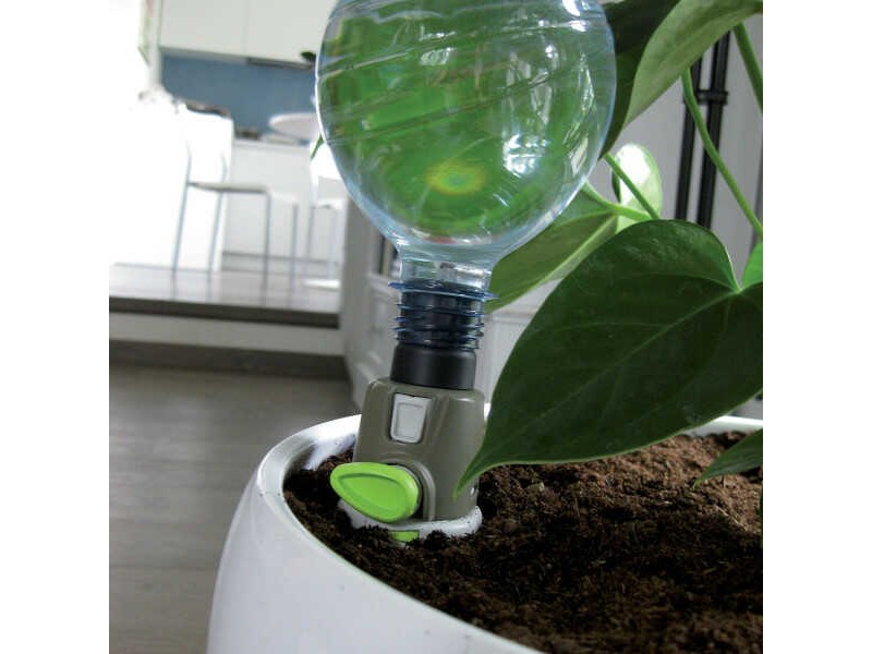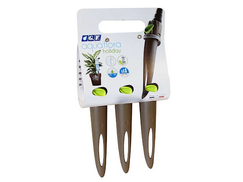 AQUAFLORA HOLIDAY TRIS Potted Plant Watering System GF8017-0087. The AQUAFLORA HOLIDAY TRIS drip irrigation system covers the water needs of potted plants for several days. Its operation is extremely simple: a plastic water bottle is fitted to the head of the irrigation part and the drip flow is carried out by adjusting the valve. Depending on the size of the pot, a plastic bottle with water is adjusted according to the volume. A drip watering system for pot plants that will keep all house plants regularly watered during excursions, trips and holidays.