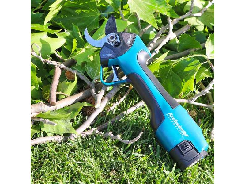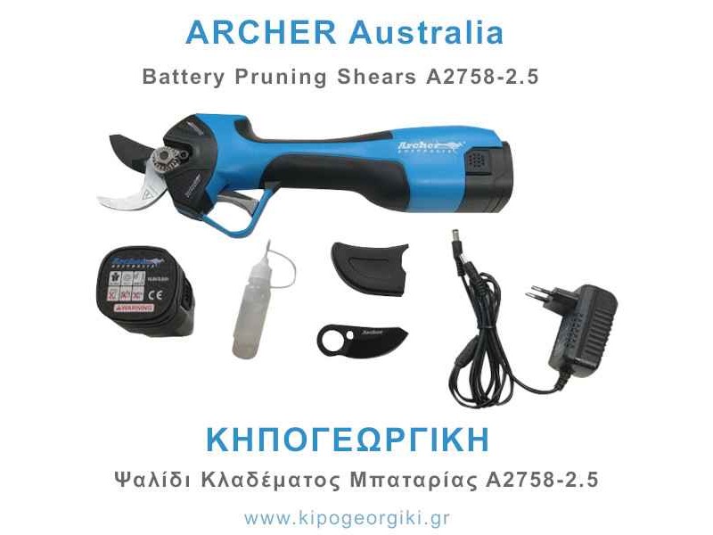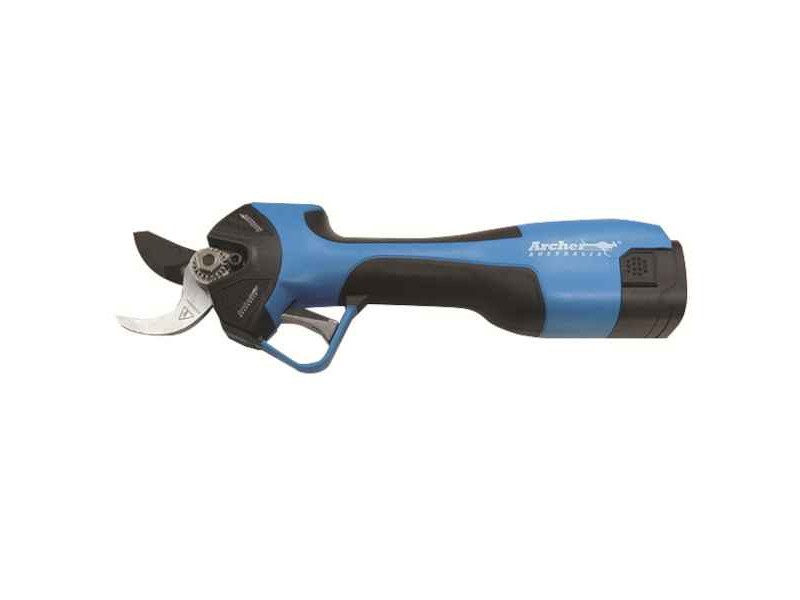 ARCHER Australia Battery Pruning Shears Α2758-2.5 Kit - Portable Pruning Shears. ARCHER Australia's A2758 portable pruning shears are one of the most suitable tools for efficient battery-powered hand pruners. Having a double blade cutting opening, pruning shoots and branches of Ø25 and Ø32mm diameter, and with a weight (including battery) of 970gr allows comfortable work. The Α2758-2.5 guarantees between 2 and 3 hours of autonomy, depending on the type of use. ARCHER pruners are supported by a full range of genuine spare parts and are covered by a 1-year warranty.