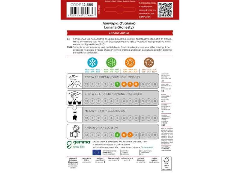 Annual Honesty 0.3g Seeds Packet (Lunaria annua). Annual plant. Suitable for garden, flower bed, edging, flower pot. It is used as a cut flower and dried flower. It looks for places with full exposure to the sun or partial shade. It blooms the following year from sowing. After the petals fall, an oval "glass" is created that can be cut and dried in a jar. Seed spacing (cm): 20. Row spacing (cm): 50. Sowing depth (cm): 0.5. Days to germination: 15. Start of flowering (days): 360. Available in a 0.3g envelope.