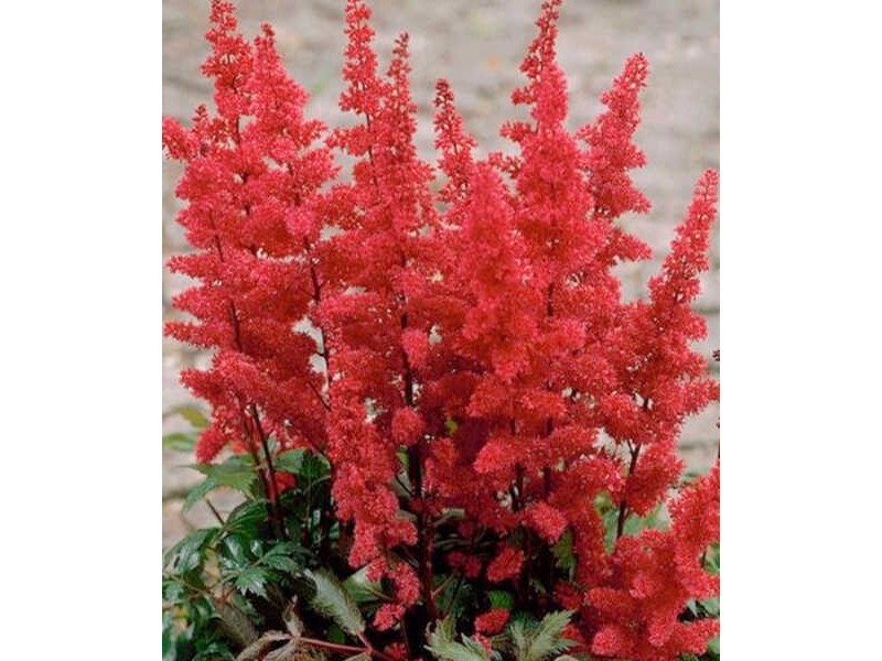 Rhizomes of monochrome Astilbe with slightly fragrant red flower. Rhizomatous perennial spring planting plant whose height can reach 0.75 m. Astilves bloom for 4 to 6 weeks, in large, impressive inflorescences. Astilbe rhizomes can be planted in the garden or in a pot and planter. Planting in pots and planters requires a high quality soil mixture, as well as pumice or other similar material, in the area of the flowerpot bottom, to facilitate drainage, which in the case of rhizomatous plants should be excellent.