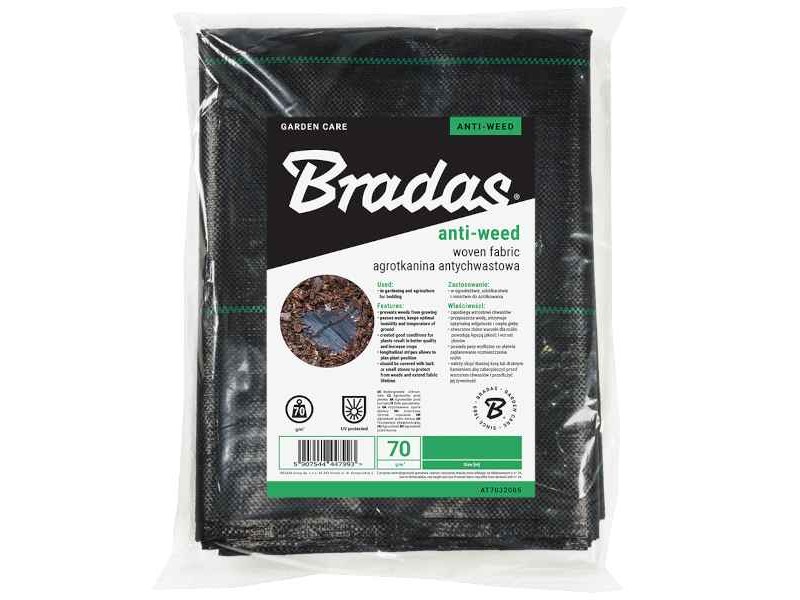 BRADAS Woven Anti-Weed PP Black UV 70gr/m² 1.6x5m. BRADAS ground cover fabric from Poland is an excellent choice for weed control in the garden or agricultural crops. Made of polypropylene (PP), this geotextile is strong and durable, even from UV radiation. Its resistance to harsh weather conditions makes it suitable for use in a variety of environments, ensuring that your plants will enjoy much-needed light, water and air without the annoying presence of weeds. Weighing 70g/m², this geotextile stands out for its strength and durability, essential for effective application. Its improved durability makes it suitable for installation in outdoor crops where conditions can be demanding. Proper application of geotextile can lead to a reduced need for herbicides, offering a greener approach to caring for your garden. This product can be used in a variety of applications such as creating flower beds, ground cover for crops, and protecting trees and shrubs from the competing forces of nature. By using BRADAS Woven Anti-Weed Geofabric 1.6x5m, gardeners and landscapers can ensure healthy and robust plants while reducing the maintenance and effort required for weed management.