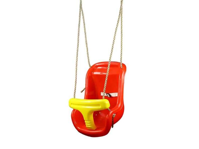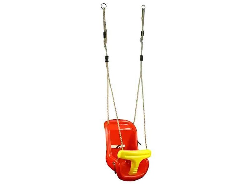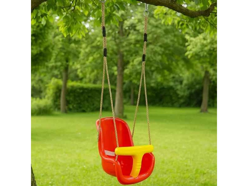 Baby Swing Seat with T-Bar Safety 28x36x42cm-Red Yellow. The baby swing seat with T-shaped safety bar in red and yellow is an ideal choice for parents who want to offer their child safe and enjoyable outdoor play in the garden or yard. Suitable for children aged 6 months to 3 years, it is designed to provide proper body posture, stability, and comfort during swinging. The front T-shaped safety bar keeps the child securely in place, while the high backrest offers additional support for the back and torso, reducing the risk of slipping. With dimensions of 28x36x42 cm, the seat fits the baby’s body perfectly, creating a reassuring sense of security. The durable polypropylene ropes, 10 mm thick and up to 1.8 meters long, are height-adjustable, allowing easy adaptation to different spaces. The metal hanging rings ensure firm and reliable installation on a pergola, a sturdy tree branch, or an existing swing frame. Designed exclusively for home use, this baby swing seat with T bar is ideal for introducing children to gentle motion, supporting balance and motor skill development. It is a high-quality outdoor baby swing that combines safety, durability, and a cheerful design for early childhood enjoyment.