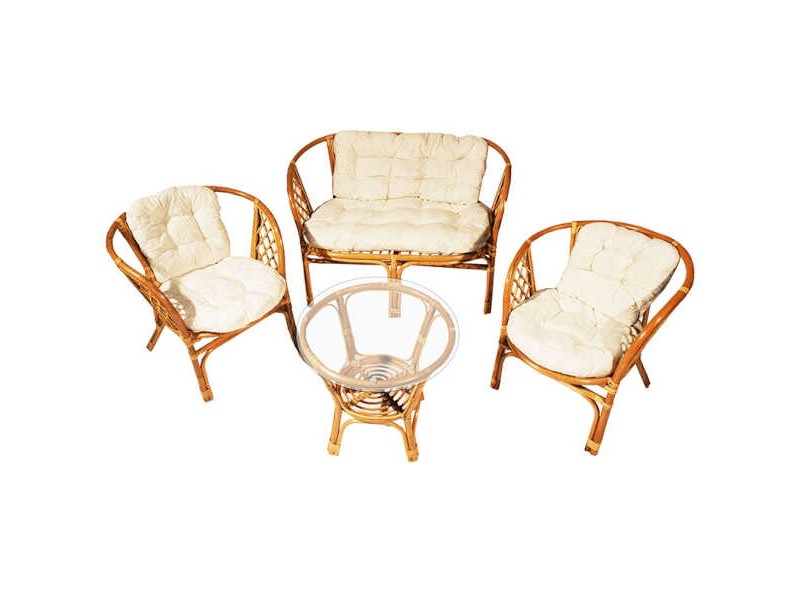 Bamboo Garden Lounge EASY Set - Garden & Patio Furniture. Elegant and durable complete outdoor lounge set. Having a flexible design it can be placed in many different architectural "style" environments. The Bamboo Garden Lounge EASY Set consists of a two-seater sofa, two armchairs as well as a round table with glass and a shelf for magazines. All cushions are included in the offered set.
