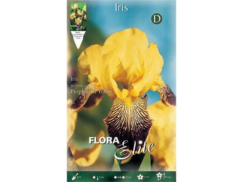 Rhizome of bicolor evergreen perennial Iris with purple and yellow color of flower. Rhizomatous plant of spring planting whose height can reach 0.75 m. Iris rhizomes can be planted in the garden or in a pot and planter. Planting in pots and planters requires a high quality soil mixture, as well as pumice or other similar material, in the area of the flowerpot bottom, to facilitate drainage, which in the case of rhizomatous plants should be excellent.