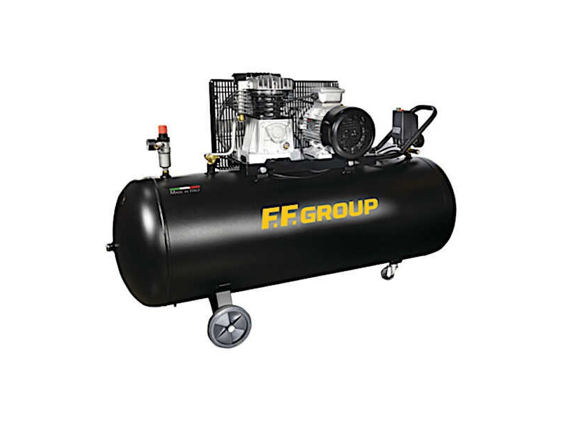 Belt-Driven Professional Air Compressor 3-Phase AC-B 200/4TC PRO FF Group/FIAC - Air Compressors.Belt-driven piston air compressors from the Italian FIAC for the FF GROUP, high performance, low noise and good value for money. They are productive, have a high resistance to time and handling, reasonable operating costs and a cylinder made of cast iron. The AC-B 200/4TC PRO air compressor is intended for heavy commercial use, equipped with a dual compressed air outlet pressure regulator and overload protection functions. It has optimal cooling, filter to reduce the amount of water - oil for sem-professional use, as well as a large window to control the quantity of oil. It also has an ergonomically designed double handle, two large SPI rubber rear wheels and a smaller front swivel to make the machine easier to transport. The professional AC-B 200/4TC PRO three-phase air compressor produced entirely in Italy by FIAC, is provided with the FF GROUP warranty, while it is supported by servis as well as original spare parts.