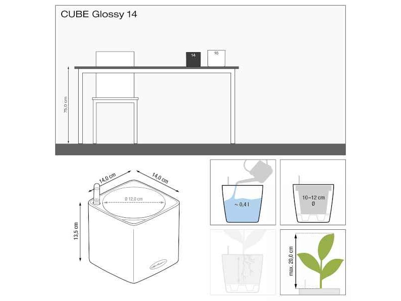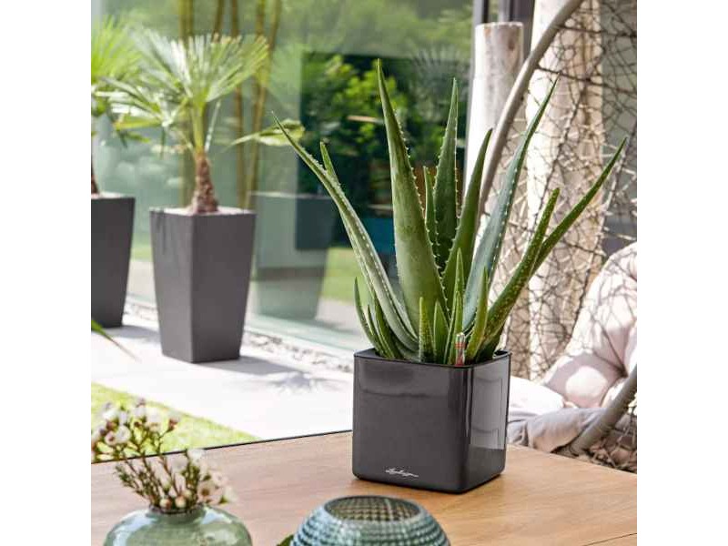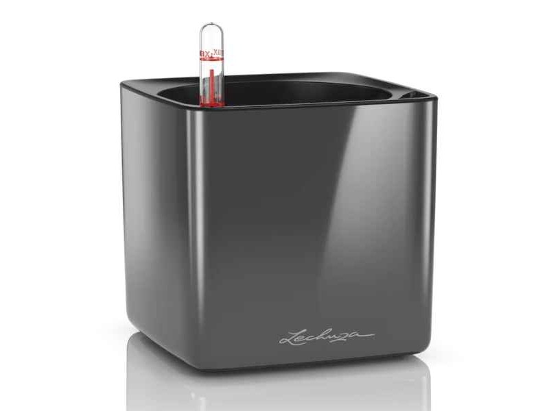 The LECHUZA CUBE Glossy series consists a collection of synthetic square planters-table pots. It includes the models CUBE Glossy 14 and 16, while it is available in a variety of sizes and colors. All models of the series is produced through a unique moulding process using specially developed materials, and utilizing to the best degree design capabilities, functionality and resistance to long-term use and stress. Each planter of the series is intended for indoor use in private or professional spaces and offices. But more information about the planters of the CUBE Glossy series, or the synthetic square planter CUBE Glossy 14 Charcoal 14x14x14cm Self-Watering Planter as well as for the other products of the company, can be found on the official website of Lechuza.