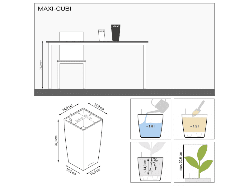 The CUBI Maxi planters are offered as a complete set, with the self-watering system, as well as with Lechuza-Pon, the special LECHUZA planting substrate.