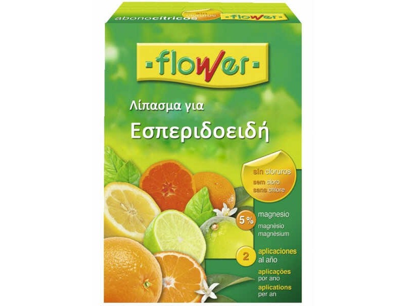 Citrus Organic Granular Fertilizer 1kg - FLOWER. Organic complete fertilizers of Nitrogen, Phosphorus, Potassium, together with Magnesium and Sulfur, suitable for any cultivation of citrus crops (Oranges, Lemons, Tangerines, etc.). The high nitrogen content (18%) facilitates plant growth, providing excellent vegetation and fruit thickening. Phosphorus (6%) contributes to the intense flowering and fruit production and promotes rooting. Potassium (6%) improves the color and taste of the fruit. The uptake of magnesium oxide (5%) plays a decisive role as it helps the plant collect solar energy and create trace elements such as zinc (Zn) and iron (Fe). Along with the organic matter it contains, the Citrus Organic Granular Fertilizer 1kg, if used systematically, increases production and naturally improves fruit quality.