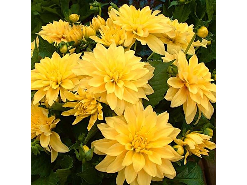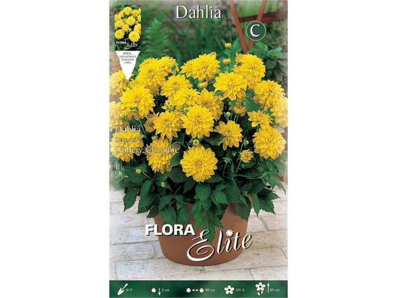 Dahlia 'Gallery Cezanne': tuberous rhizome of monochromatic Dahlia hybrid variety with yellow color of double flower. The Dahlia 'Gallery Cezanne' is tuberous deciduous perennial, shrubby and spring planting, the height of which can reach fom 0.30 up to 0.40 m. Dahlias blooms about 10 to 12 weeks after planting, with large and strikingly colored flowers, while their flowering begins in early summer and lasts until autumn. Dahlia tuberous can be planted in the garden or in a pot and planter. Planting in pots and planters requires a high quality soil mixture, as well as pumice or other similar material, in the area of the flowerpot bottom, to facilitate drainage, which in the case of tuberous plants should be excellent. The Gallery® Series gives Dahlias extremely compact and with abundant flowering.