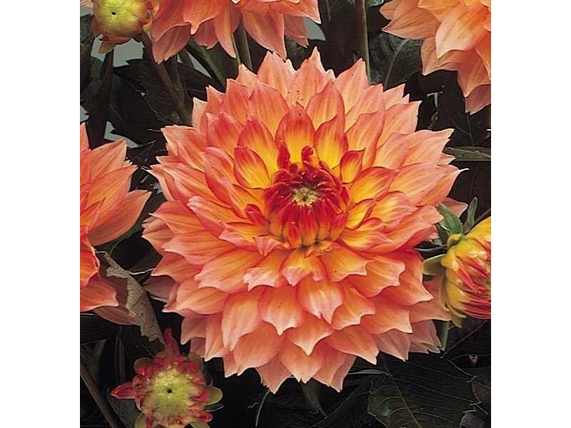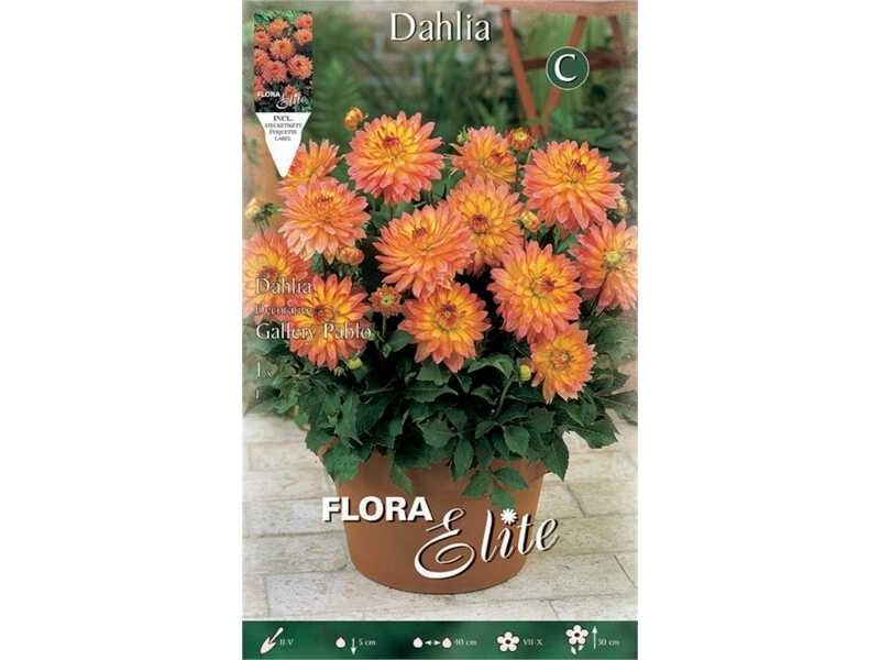 Dahlia 'Gallery Pablo': tuberous rhizome of monochromatic Dahlia hybrid variety with orange color of double flower. The Dahlia 'Gallery Pablo' is tuberous deciduous perennial, shrubby and spring planting, the height of which can reach fom 0.30 up to 0.40 m. Dahlias blooms about 10 to 12 weeks after planting, with large and strikingly colored flowers, while their flowering begins in early summer and lasts until autumn. Dahlia tuberous can be planted in the garden or in a pot and planter. Planting in pots and planters requires a high quality soil mixture, as well as pumice or other similar material, in the area of the flowerpot bottom, to facilitate drainage, which in the case of tuberous plants should be excellent. The Gallery® Series gives Dahlias extremely compact and with abundant flowering.