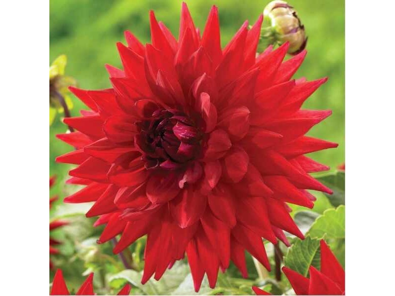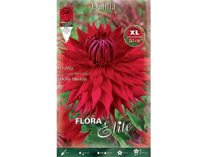 Dahlia 'Holly Huston': tuberous rhizome of bicolor Dahlia cultivar with red color of a huge flower about 30 cm in size. The Dahlia 'Holly Huston' is tuberous deciduous perennial, shrubby and spring planting, the height of which can reach fom 0.90 up to 1.00 m. Dahlias blooms about 10 to 12 weeks after planting, with large and strikingly colored flowers, while their flowering begins in early summer and lasts until autumn. Dahlia tuberous can be planted in the garden or in a pot and planter. Planting in pots and planters requires a high quality soil mixture, as well as pumice or other similar material, in the area of the flowerpot bottom, to facilitate drainage, which in the case of tuberous plants should be excellent.