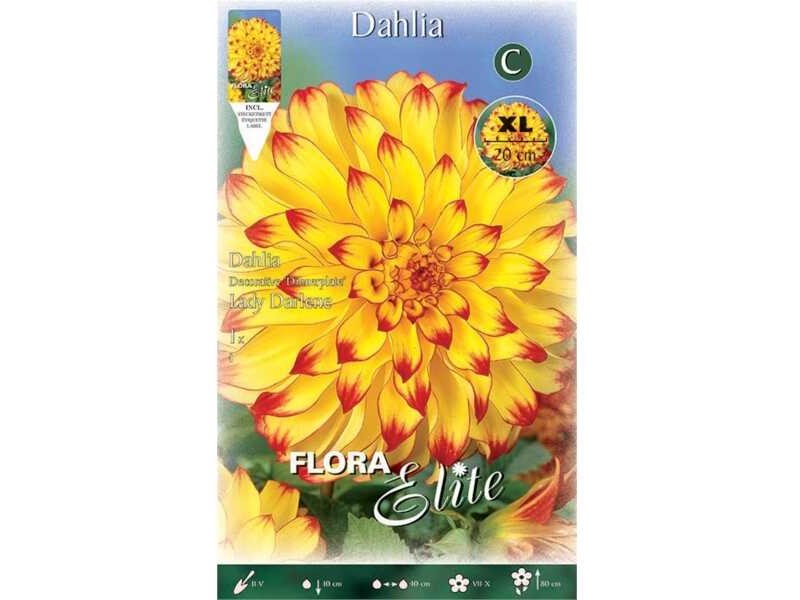 Dahlia Lady Darlene: tuberous rhizome of bicolor Dahlia cultivar with yellow - orange color of a huge flower about 30 cm in size. The Dahlia Lady Darlene plants are tuberous deciduous perennials, with bushy habit and spring planting, the height of which can reach 0.90 to 1.10 m. Dahlias blooms about 10 to 12 weeks after planting, with large and strikingly colored flowers, while their flowering begins in early summer and lasts until autumn. Dahlia tuberous can be planted in the garden or in a pot and planter. Planting in pots and planters requires a high quality soil mixture, as well as pumice or other similar material, in the area of the flowerpot bottom, to facilitate drainage, which in the case of tuberous plants should be excellent.