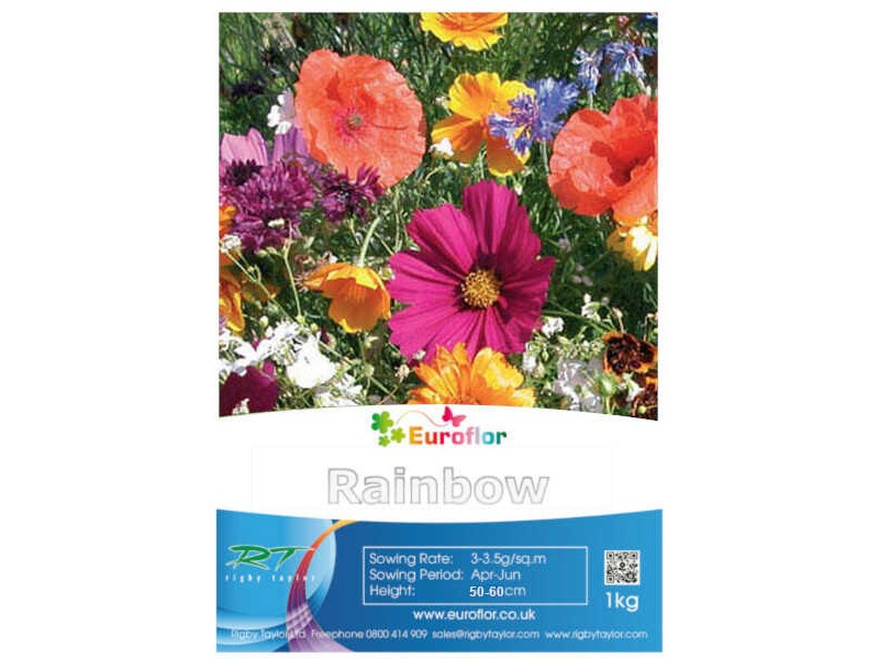 EUROFLOR Rainbow Annuals 1kg Seeds Mixture for Urban Meadows - Urban Meadows Seed Mixes. A veritable rainbow of colors is hidden within the Rainbow Annuals seed mix. Sixty days after sowing it reveals itself, presenting an impressive combination of colors. Colors bright, where red, orange, yellow, blue and white attract the eye in an unparalleled spectacle until the first frosts. The plants that come from the seeds of the mixture are all annuals.
