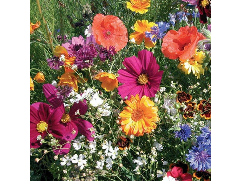 ► The mixture includes the following species and varieties: Arabis alpina 'Corbeille d'Argent', Calendula officinalis 'Pacific Beauty', Centaurea cyanus 'Boy Blue', Coreopsis picta 'Be-Bop', Coreopsis tinctoria, Cosmidium burridgeanum 'Phillipine', Cosmos 'Trianon', Eschscholtzia californica, Gypsophilia elegans 'Roi des Halles', Linum grandiflorum, Linum grandiflorum 'Charmer Mix', Papaver rhoeas