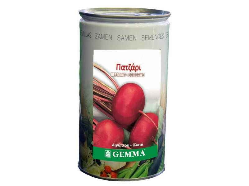Egyptian Beetroot R0231C 0.5kg Canned Seeds (Beta vulgaris conditiva 'Egyptian'). Annual plant. Early variety with a flattened and rounded root, deep red in color. The foliage is dark green with red stems and veins. Available in a 500g can.
