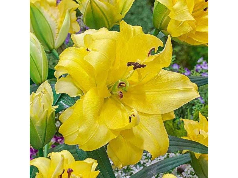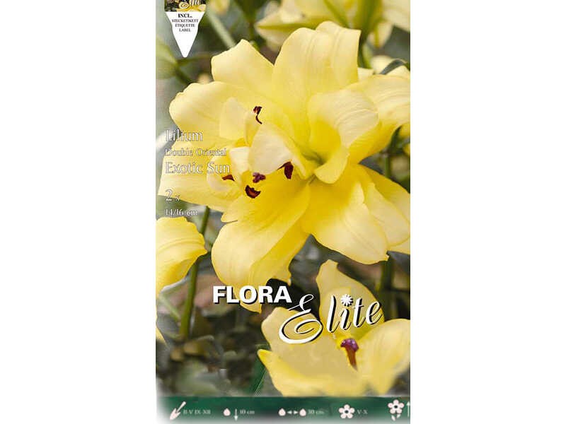 Exotic Sun Lily: monochrome bulbs of Oriental Lily with yellow color of fragrant double flower. The Oriental Lilies are perennial bulbous plants of spring planting whose height can reach 0.90 m with the flower. Lilies bloom in summer, with fragrants flowers of different sizes and impressive colors. The Oriental Lily bulbs can be planted in the garden or in a pot and planter - but always in soil that is not alkaline. Planting in pots and planters requires a high quality soil mixture, as well as pumice or other similar material, in the area of the flowerpot bottom, to facilitate drainage, which in the case of bulbous plants should be excellent. The Exotic Sun Lily is useful to stake in order to have an attractive appearance throughout the whole flowering period.