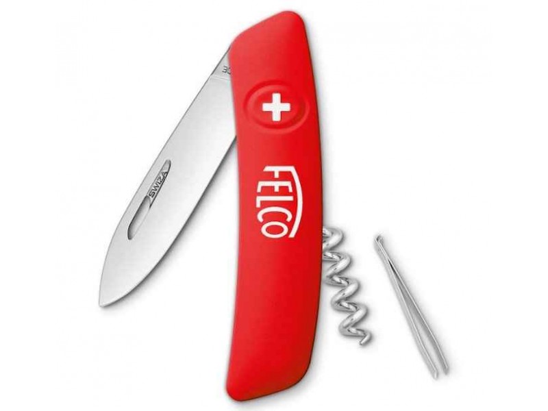 Swiss Pocket Knife Felco 501. Revolutionary and ergonomic knife design. Strong blade, 440 AISI stainless steel, 57 HRC, locked in open position, released by pressing the button on the side (Swiss cross). Blade with slot for easy opening by right- or left-handers. Sommelier corkscrew with 5 turns. Compact design with robust steel plate construction. 'Soft Touch', scratch-resistant grip. Dishwasher safe (up to 80°C / 176°F).