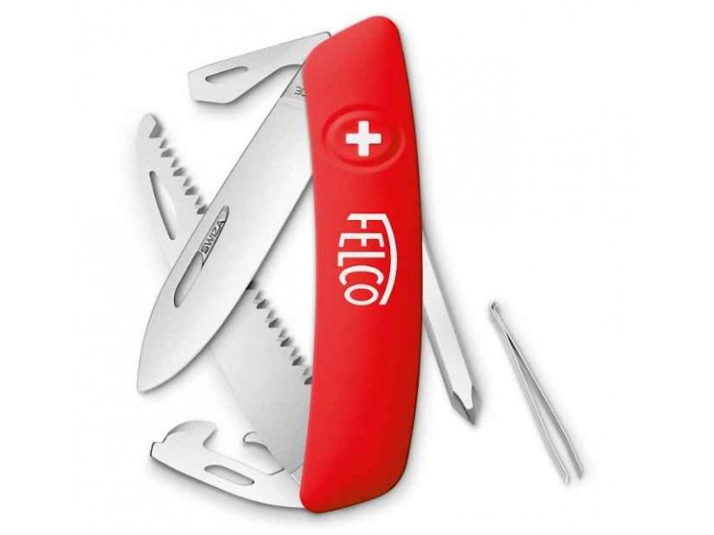 Swiss Pocket Knife Felco 506. Revolutionary and ergonomic knife design. Strong blade, 440 AISI stainless steel, 57 HRC, locked in open position, released by pressing the button on the side (Swiss cross). Blade with slot for easy opening by right- or left-handers. Opener & saw. Size 1 & 3 straight screwdrivers. Size 1 Phillips screwdriver. Compact design with robust steel plate construction. 'Soft Touch', scratch-resistant grip. Dishwasher safe (up to 80°C / 176°F).
