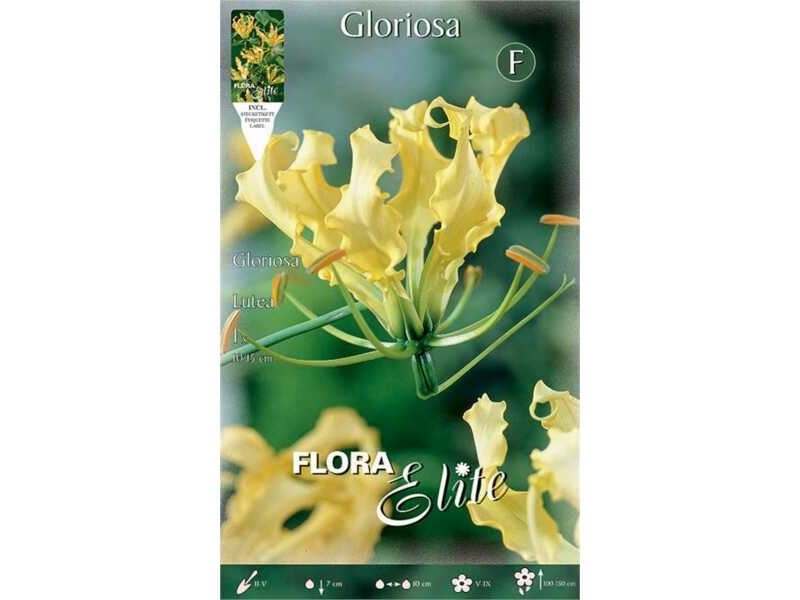 Tubers of monochrome perennial Gloriosa deciduous with yellow color of particularly impressive flower. Tuberous plant of spring planting, with the ability of climbing thanks to the tendrillss, the height of which can reach 1.50 m. Fire Lilies grow in medium loamy soils, acidic, neutral or alkaline reaction, while after many weeks of abundant flowering it is recommended to prune vigorously. Fire Lilies tubers can be planted in addition to the garden and in a pot or planter. Planting in pots and planters requires a high quality soil mixture, as well as pumice or other similar material, in the area of the flowerpot bottom, to facilitate drainage, which in the case of bulbous plants should be excellent.