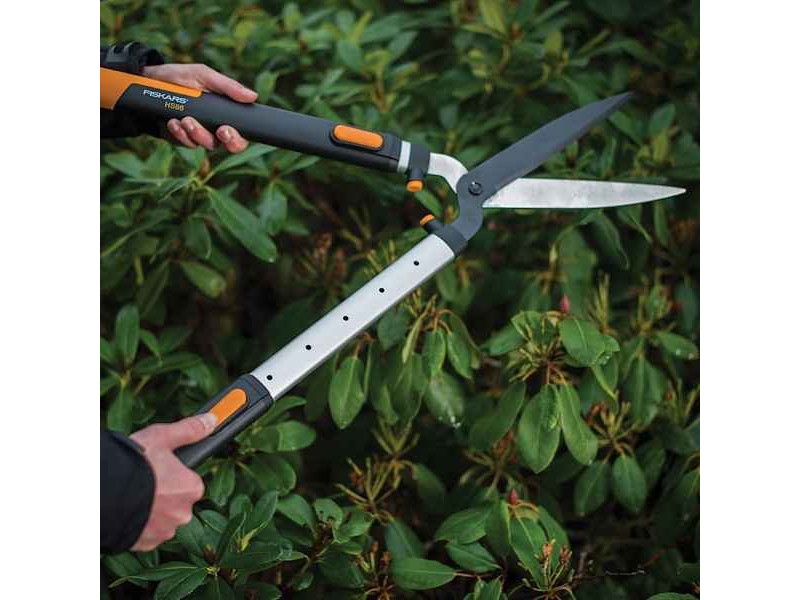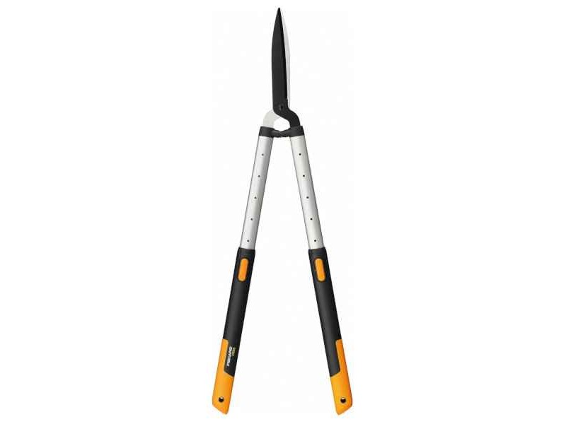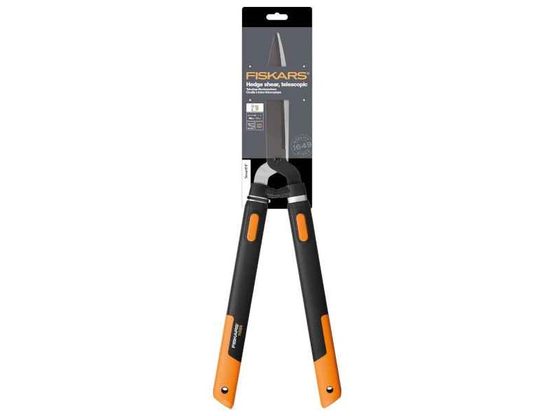 FISKARS 73.5cm HS86 Smart Fit Telescopic Hedge Shears - Shears-Secateurs-Pruners. The HS86 Smart Fit Telescopic Hedge Shears by FISKARS (founded in 1649) are of high strength, cutting precision and performance. The high-quality, ergonomic, extendable (from 67.5 to 92.5 cm) SoftGrip™ technology handles are made of reinforced plastic and always ensure a soft, safe, secure, shock-absorbing grip. The blades are machined and hardened. They are stainless steel, straight, and sharp for a long time. The HS86 Smart Fit Telescopic Hedge Shears are offered with a 1-year warranty.