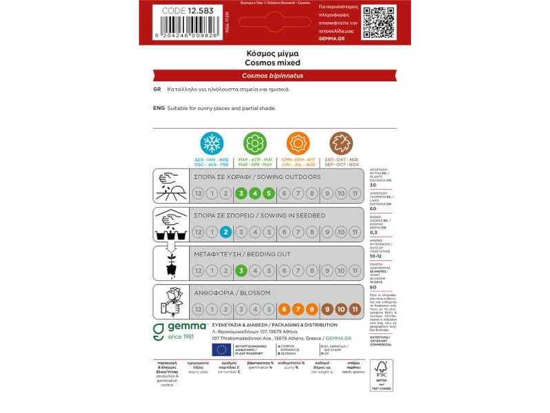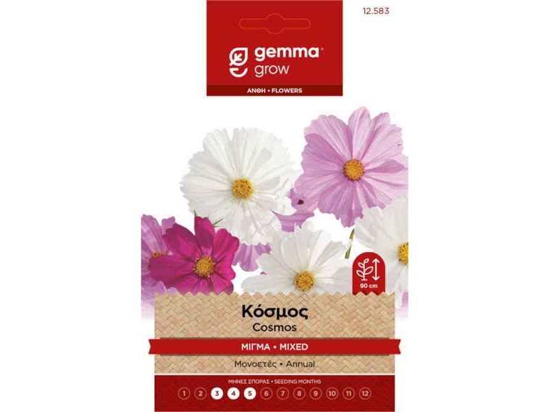 Garden Cosmos Mix 0.5g Seeds Packet (Cosmos bipinnatus). Annual plant. Suitable for garden, flower bed, pot. Seeks positions with full exposure to the sun. Seed spacing (cm): 30. Row spacing (cm): 60. Sowing depth (cm): 0.3. Germination days: 10-12. Start of flowering (days): 60. Available in a 0.5 g envelope.