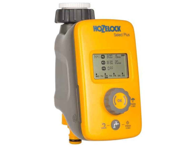 HOZELOCK Select Plus Battery Powered Water Timer - Automatic Irrigation Controllers & Timers. Reliable and easy to use irrigation timers produced by the British company HOZELOCK (founded in 1959). Select Plus is a versatile and robust watering tool that allows the garden to be watered in a completely automatic way according to the needs of the plants and the preferences of users and fans. The Select Plus irrigation controller has an easy-to-read LCD display and offers the possibility of selecting watering at any time and on any day, as well as a manual irrigation function. Each selected setting will allow you to water up to 3 times per day from 1 minute to 199 minutes. The large LCD screen displays all program information and allows for easy setup and adjustment using the rotary switch. It is available in a box and comes with a 2-year guarantee.