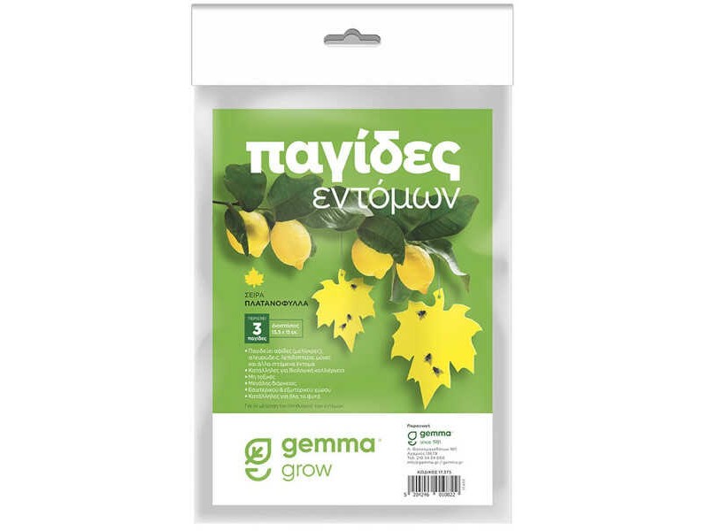 Ecological Insect Traps 3pcs Platanus Leaves Series GEMMA. Inventive design insect traps made of paper pasted with glue, in a yellow color that attracts insects. In particular, the ecological Insect Traps are suitable and particularly effective for the capture/trapping and control of a large number of flying insects annoying to humans (flies, mosquitoes, etc.), as well as several harmful to plants (aphids, Whiteflies, etc.). The traps are non-toxic, user safe and environmentally friendly. They are available in 3 pieces in the shape of plantain leaves, size 15.5 x 15 cm. They are particularly suitable for placing on garden plants and trees. The installation of each insect trap of the Platanus Leaves Series is done by hanging it on the plants near the leaves, in the lowest parts of them (preferably towards the east and in cool places), and in indoor or outdoor areas in places where flying insects gather, avoiding contact with surfaces such as walls. Once placed, the protective paper is then removed by holding the trap from the top where it has no glue. The insect trap changes when the sticky surface is filled with insects, while its lifespan is up to 12 months from its installation depending, mainly, on the weather conditions.