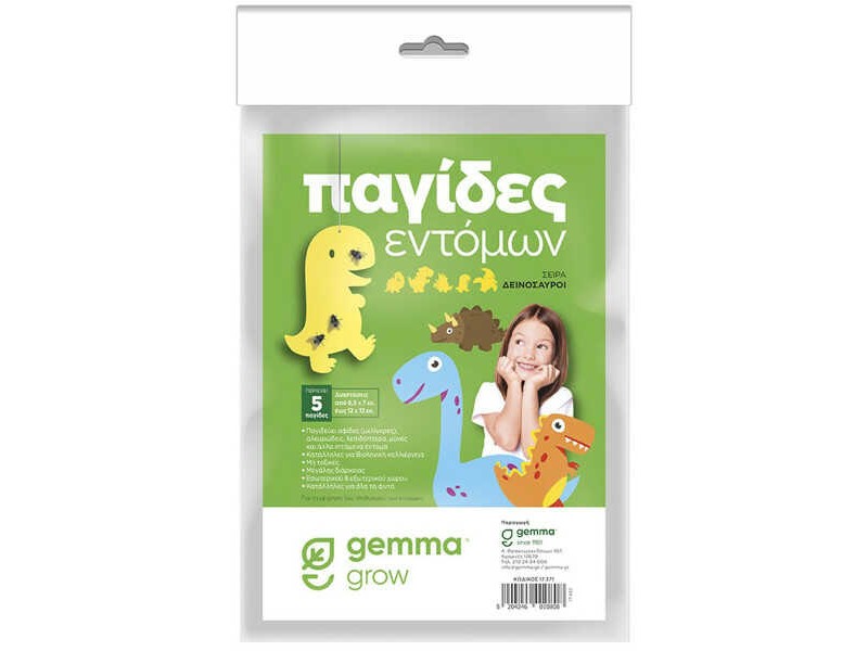 Ecological Insect Traps 5pcs Dinosaur Series GEMMA. Inventive design insect traps made of paper pasted with glue, in a yellow color that attracts insects. In particular, the ecological Insect Traps are suitable and particularly effective for the capture/trapping and control of a large number of flying insects annoying to humans (flies, mosquitoes, etc.), as well as several harmful to plants (aphids, Whiteflies, etc.). The traps are non-toxic, user safe and environmentally friendly. They come in 5 different shapes of humorous dinosaurs and are conveniently small in size (from 8.5 x 7 cm to 12 x 12 cm). The small size makes them extremely flexible, allowing them to be placed even on small growing plants, such as orchids. They are particularly suitable for indoor spaces as well as balconies, and in environments where small children aged 4-10 years live. The installation of each insect trap of the Dinosaur Series is done by hanging it on the plants near the leaves, in the lowest parts of them (preferably towards the east and in cool places), and in indoor or outdoor areas in places where flying insects gather, avoiding contact with surfaces such as walls. Once placed, the protective paper is then removed by holding the trap from the top where it has no glue. The insect trap changes when the sticky surface is filled with insects, while its lifespan is up to 12 months from its installation depending, mainly, on the weather conditions.