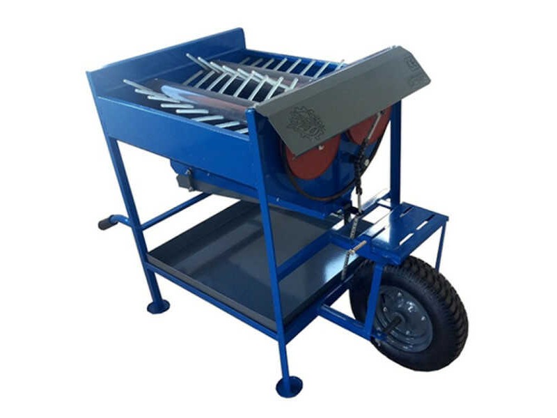 The Greek company KARKAVELLIAS produces the wheeled Olive Harvesting Bench With 1 Wheel without motor. Using innovative technology, it simplifies the process of removing olives from the branches, offering substantial help to those involved in olive cultivation - professional olive growers and private individuals. The harvesting bench is equipped with horizontal rollers fitted with silicone-coated durability sticks. The sticks rotate on their shaft, which is driven by a gasoline engine of 4.5 HP or more. This mechanism allows the sticker to operate in a reliable manner and exhibits high durability and performance. The process of racking is easy and quick. Branches and twigs with olives already pruned from the tree are placed vertically on the rollers of the bench. And as the rollers rotate, the sticks shake the olives away from the branches. Still, the bench of the machine is equipped with a single transport wheel. This allows it to easily fit into narrow passages where other tools are unable to pass. In addition, a practical feature of the olive harvester is the built-in slots for hanging the storage bag. When the bench separates the leaves from the wrist, the leaves automatically fall into the bottom pan. At the same time, the olives are bagged in the hanging bag, offering convenience and a smoother workflow. The yield reaches 300 - 400 kg per hour (depending on the variety of olive). The Olive Harvesting Bench With 1 Wheel comes with a manufacturer's warranty and is backed by service and genuine spare parts. It carries the CE mark of the European Union and complies with all safe operation regulations.