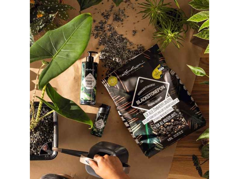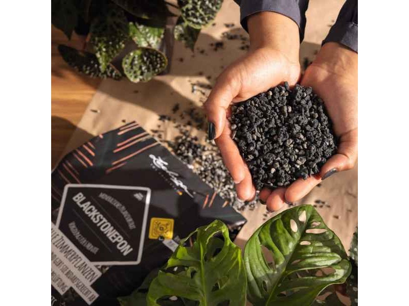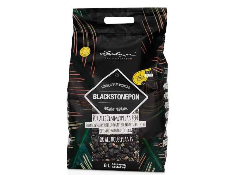 LECHUZA Blackstonepon Mineral Substrate For All House & Office Plants - Indoor Plants Substrates. As a high quality packaged substrate, LECHUZA Blackstonepon ensures - thanks to its highly balanced composition - healthy and robust plants. The planting substrate provides the optimum ratio of air, water and fertilizer, together with a stabilised soil pH, so that it continuously releases nutrients to the potted plants and those in the garden according to their needs. The substrate consists of zeolite, pumice, light lava, vegetable carbon (biochar) and slow-release fertilizer. It also includes black lava for greater heat storage. The proportions of the ingredients are very well thought out, so that from a structural point of view the substrate is not at risk of compaction or sedimentation. It is suitable for any Indoor Plant and offers an advanced alternative to conventional soil or packaged potting soil, as it can be used instead. The presence in the substrate of the slow release fertilizer results in nutritional adequacy to plants for approximately 6 to 8 months. The product does not contain peat for environmental reasons. In addition to its use purely as a substrate or for complete planting, Blackstonepon, with its black colour, can also be used as a decorative surface layer on potted plants or garden plants.