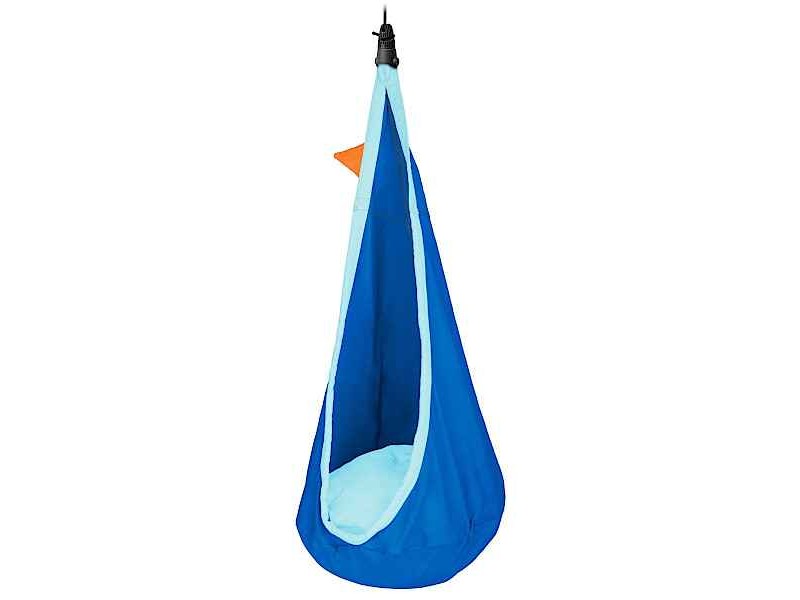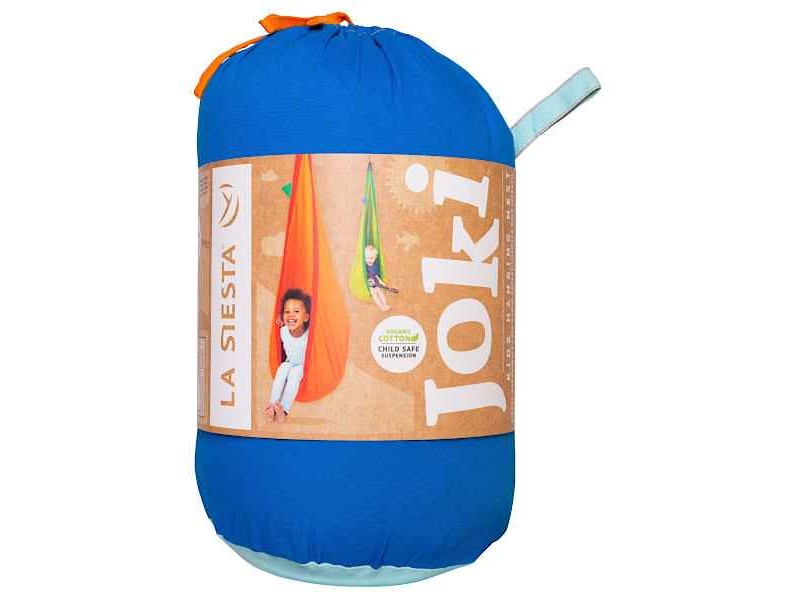 La Siesta JOKI DOLPHY Organic Cotton Kids Hanging Nest with Suspension - Bio Cotton Children's Hanging Nests. High quality handmade bio-fabrics for Kids Hanging Nests and nests from the specialized in the production of nests and hammocks company LA SIESTA. They belong to the JOKI DOLPHY series and are made entirely from certified organic cotton (organically grown), based on the principles of sustainability. When placed in the children's room (or other indoor or outdoor areas) they add an extra dimension of play or relaxation and balance. Children (from 3 years and up) enjoy the JOKI hanging nest and develop skills by taking up the Kids Nest as a means of entertainment and shelter. The new generation of children's hanging nests not only has a modern design, but also sets new standards in terms of safety and comfortable suspension. Both LA SIESTA's patented MultiSpot system and the innovative SmartSwivel support mechanism contribute to this. The MultiSpot system ensures safe, quick and easy positioning of the children's hanging nest. The SmartSwivel support mechanism enables the nest to be rotated, guaranteeing not only greater safety and durability of the Kids Hanging Nest but also preventing it from twisting. Moreover, it facilitates the removal of the JOKI nest and makes the height adjustment simple through a single step. The hanging Nest has reinforced sides, which reduce wear and tear and are pleasantly soft. The nest, since it is a product for children, must of course also be easy to clean. For this reason, the cushion and attachment fittings can be easily separated from it. The JOKI DOLPHY Organic Cotton Kids Hanging Nest has blue and light blue hue, and is offered complete (together with the cushion, MultiSpot system and SmartSwivel support mechanism), ready to install.