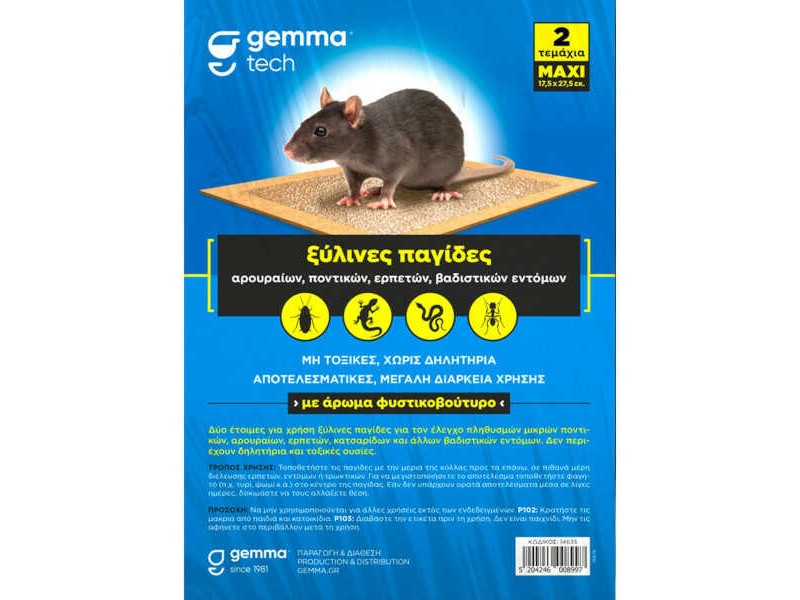 Large Wooden Glue Traps 17.5 x 27.5cm for Rodents 14635. Two ready-to-use wooden traps to control populations of small mice, rats, reptiles and other walking insects. They do not contain poisons and toxic substances. With its special aroma of peanut butter, it attracts rodents that look for food when they enter a space. The glue traps the rodent. The wooden surface ensures the trapping of large rats.