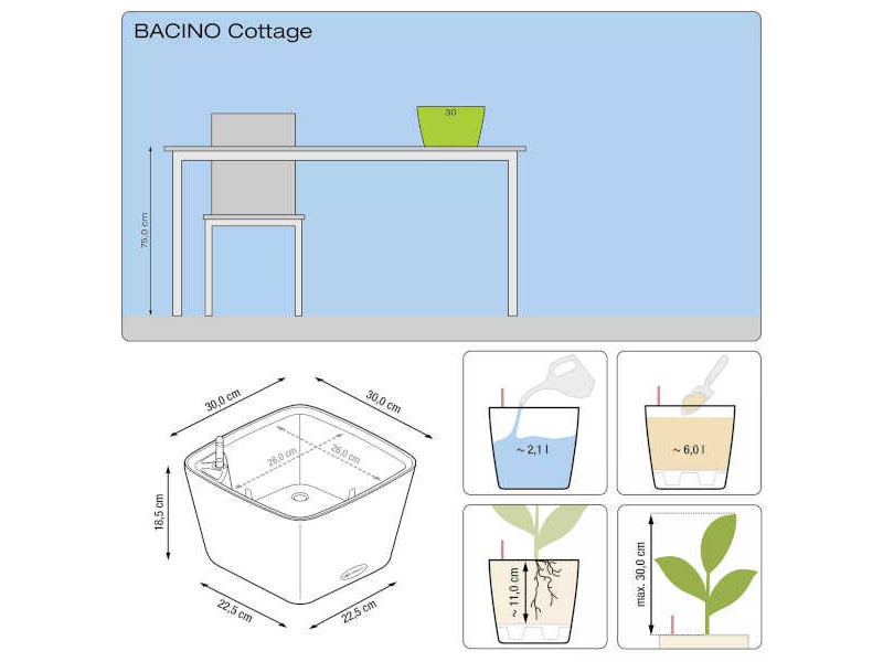 BACINO Cottage 30 Sand Brown 30x30x(H)18cm Self-Watering Planter-Cachepot LECHUZA Complete. The BACINO Cottage 30 self-watering planter by LECHUZA is the perfect choice for those seeking a blend of elegant design, functionality, and effortless plant care. With dimensions of 30x30 cm and a height of 18 cm, it fits beautifully into any space, whether indoors on a table, floor, or office, or outdoors on a balcony, terrace, or garden. The specially developed inorganic growing medium (Lechuza-Pon), enriched with zeolite, lava, and NPK fertilizers, promotes strong root development and healthy plant growth. The integrated LECHUZA self-watering system allows plants to absorb exactly the amount of water they need from the 2-liter water reservoir, reducing daily watering and ensuring healthy growth. The practical drainage valve makes the planter suitable for outdoor use, protecting roots from excess water during rainy periods. The removable inner planting liner features patented retractable handles, allowing easy handling even of tall plants and enabling quick, clean plant replacement. Crafted with LECHUZA’s renowned quality, the BACINO Cottage 30 combines durability with refined aesthetics and is available in four stylish colors: Granite, Sand Brown, Mocha, and White, making it easy to match any décor style. A modern self-watering planter that turns gardening into a truly enjoyable experience.