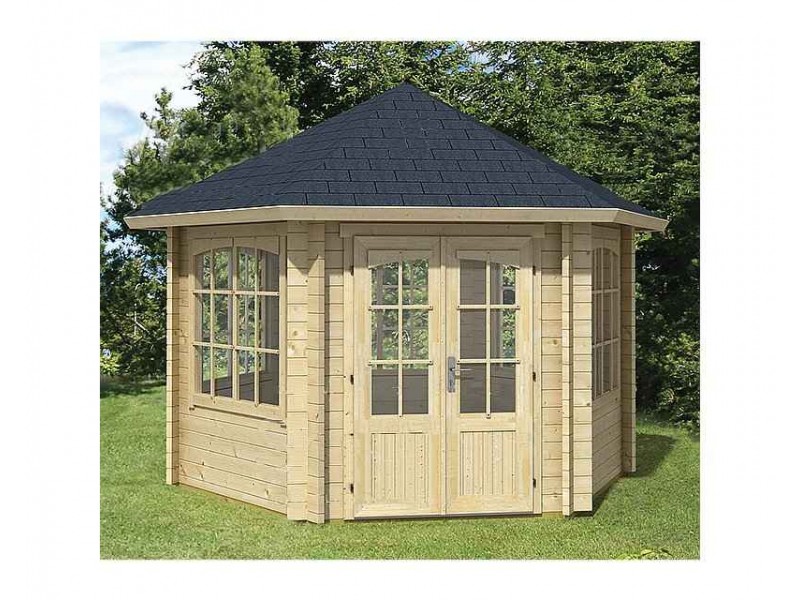 Log House Kalypso 323 x 370cm. Log houses of the Kalypso range help to meet the needs for housing, offering a few squares of residence in the countryside. They are an advantageous and environmentally friendly habitation solution, since they are quickly assembled while they are made of top quality fir timber, certified with FSC® good environmental logging. The treated Scandinavian fir wood of these wooden houses is an excellent insulating material, adjusting both the temperature and the moisture inside the log house in a completely natural way. Every wooden house of this series of houses has been created following ISO-9001 to ensure the top-quality of product.