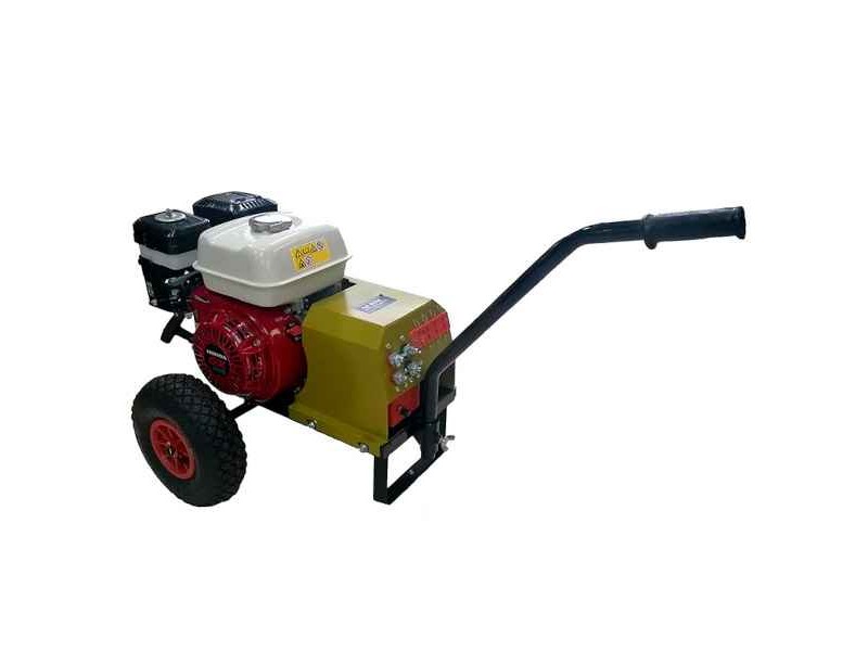 The Greek company SIK Kyriakakis manufactures the HONDA GX200 12-30V 100A Wheeled Olive Harvester Generator as an excellent choice for the perfect mechanical equipment, primarily for the producers of edible and oilseed olives. The olive and fruit racker wheel generator is an excellent tool designed to provide maximum efficiency to users. Constructed with a powerful 100A dynamo electrical system, this machine has the ability to easily power from one to four electric olive harvester rods. With a 12-position speed regulator and top-of-the-line features, it additionally allows operators to adjust the speed of each electric rod according to his individual needs. One of the advantages of working with this generator is that it is fully compatible with all brands of rods, regardless of manufacturer, making it a flexible and customizable option for any user. In addition, the presented stick rod generator features the powerful HONDA GX200 6,5HP motor, which is a gasoline engine of great durability and reliability, and the dynamo it carries is entirely new and not a remanufactured product. The HONDA GX200 12-30V 100A Wheeled Olive Harvester Generator by MINOS SIK is a handy and functional machine, which substantially assists the amateur grower and the professional producer- tree grower in the harvesting of olives as well as those fruits of the trees, which respond to this method of harvesting. Offered with a manufacturer's warranty and backed by service and genuine parts.