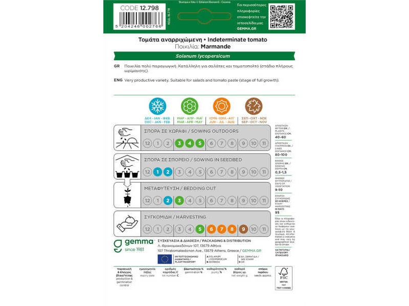 Marmande Tomato Seeds 1.5 Packet (Solanum lycopersicum 'Marmande'). A particularly aromatic fruit. Annual. Very productive variety. Suitable for salads and tomato paste (full ripening stage). Plant distance (cm): 40-60. Seed spacing (cm): 80-100. Sowing depth (cm): 0.5-1.5. Germination days: 9-10. Start of harvest (days): 95. Available in a 1.5g envelope.