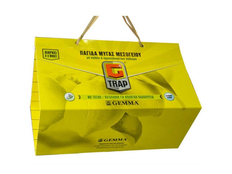 Mediterranean Fly Trap Diamond Shape Sticky Surface GEMMA. Effective traps for control of Mediterranean Flies (Ceratitis capitata), by the Greek company GEMMA. They are diamond-shaped, and contain fly food attractant bait together with a special composition of glue, which is highly resistant to UV radiation. The Mediterranean Fly Trap Diamond Shape Sticky Surface with sticky surface is applied to any tree crop that is endangered by the Mediterranean Fly (Citrus, etc.).