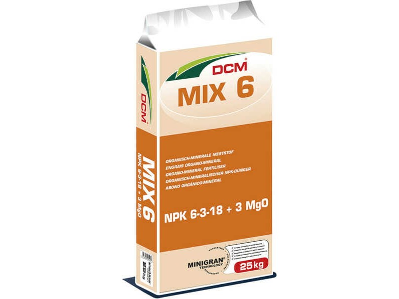 Organic Complex Fertilizer Mix 6 DCM (6-3-18+3ΜgO+28%o.m.) 25kg - Fertilizers. The Mix 6 DCM fertilizer is suitable for the nutrition of plants, especially horticultural and fruit trees. It works effectively in soils of light texture, which are characterized as poor in potassium content. The Mix 6 is an organic microgranule fertilizer that when applied does not cause dust, which is produced from carefully selected raw materials, and as it is broken down by beneficial soil microorganisms, it provides all the necessary nutrients to plants. In this way, the plants grow smoothly, without stress phenomena, and the fertility of the soil increases. The Organic Complex Fertilizer Mix 6 DCM, except for horticultural and fruit crops (especially citrus fruits), is very effective in all perennial crops, covering their basic or supplementary nutritional needs.