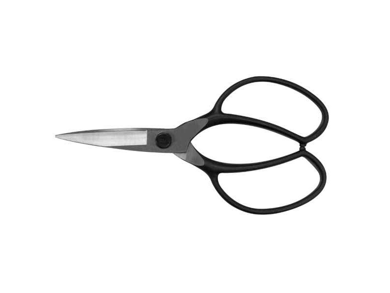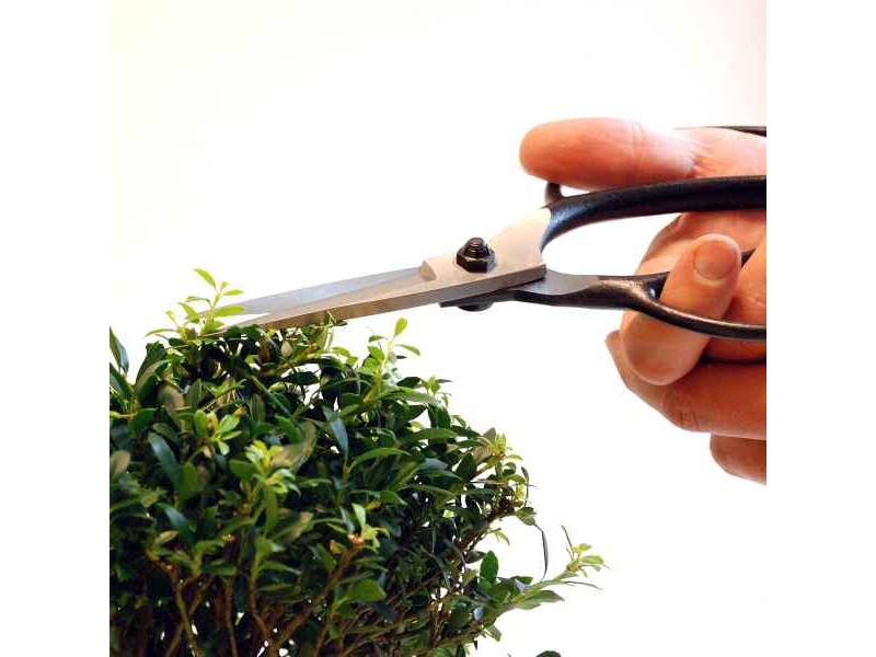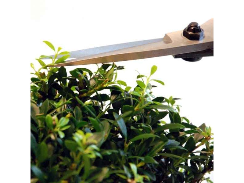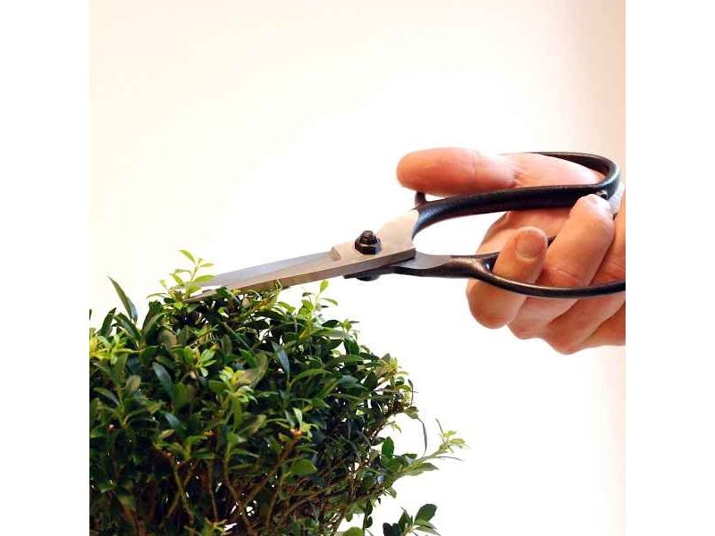 Bonsai Scissors 75mm OKATSUNE 200 Large Model - Japanese Bonsai Scissors. The OKATSUNE 200 is a professional, lightweight pruning scissor, which weighs only 285 gr. It is a traditional Japanese bonsai scissors, suitable for shaping and preserving the respective plants with great precision. These scissors are also suitable for trimming boxwood and pine trees in the Japanese-style garden. The sharp, ultra-thin 75mm blades ensure deep penetration into the miniature shrub or tree for cutting fresh parts of the shrub or tree, such as unwooded shoots and leaves. The blades of these Japanese tools are forged from the best Japanese steel, the IZUMO YASUGI, and have a very high hardness (Rockwell: 60 to 61). As a result, the blades remain sharp for a long time and consistently give a clean and precise cut in the wood without a particularly high effort. In addition, the OKATSUNE 200 combines hardness with functional flexibility, so that the cutting blade is always aligned with the opposite blade, even after intensive use. Still, the blade is ground at two angles so that it cuts smoothly through wood and does not unnecessarily injure the plant. Due to the unique shape of the hollow ground blade, the juice flows away from the blade and the blades do not separate. The V-shape of the spring ensures that the cutting load is evenly distributed along the entire length of the spring, making it soft to close. In general, Okatsune scissors are the undisputed number 1 in Japan, the country from which this type of mini-plant shaping originated.