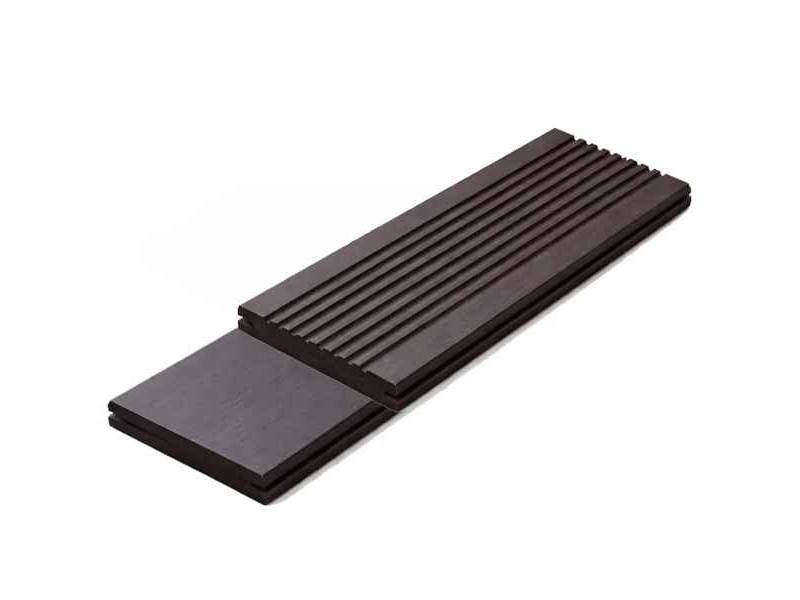 Outdoor Anthracite Bamboo Decking 2x14x185cm Carbonized-REBO. The outdoor bamboo decking of REBO (Fujian Golden Bamboo Industry) is the ideal choice for those seeking a durable outdoor flooring solution with a natural look and long lifespan. Made from high-quality bamboo and processed with Medium Carbonized technology, it offers an excellent balance between hardness and flexibility, ensuring high resistance to daily use and changing weather conditions. Its anthracite shade blends seamlessly into any environment, whether it’s a garden, terrace, or commercial space, creating an elegant and timeless result. The product features a dual-sided surface (smooth or grooved), providing flexibility in design and installation, while also offering reliable slip resistance (R10) for everyday safety. It stands out for its excellent moisture resistance and dimensional stability, reducing deformation over time. With minimal maintenance—just 1–2 applications of suitable oil per year—it retains its appearance and performance for 20–30 years, making it a high-value investment. Additionally, it complies with strict European quality and safety standards (REACH / SVHC, E1, Class 4), ensuring reliability and peace of mind. If you are looking for premium bamboo decking, durable and visually appealing, this solution perfectly combines performance and aesthetics for any outdoor application.