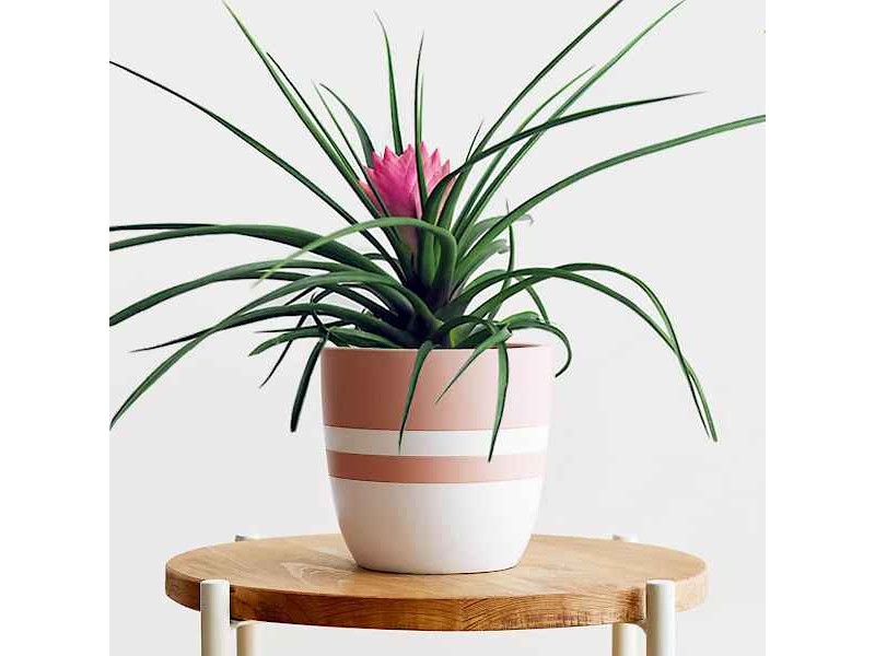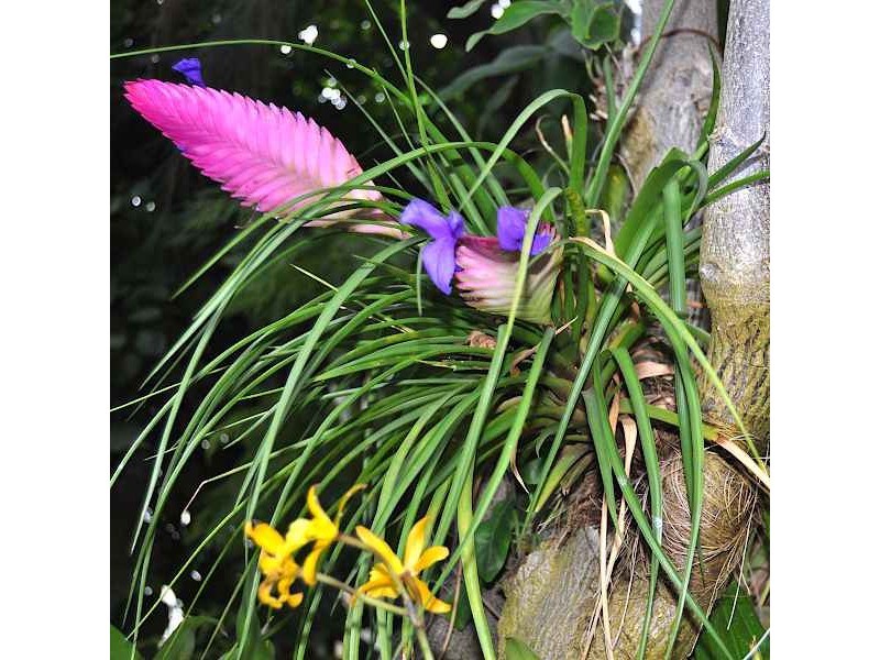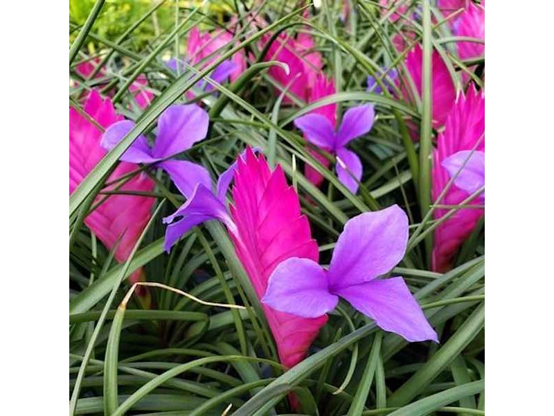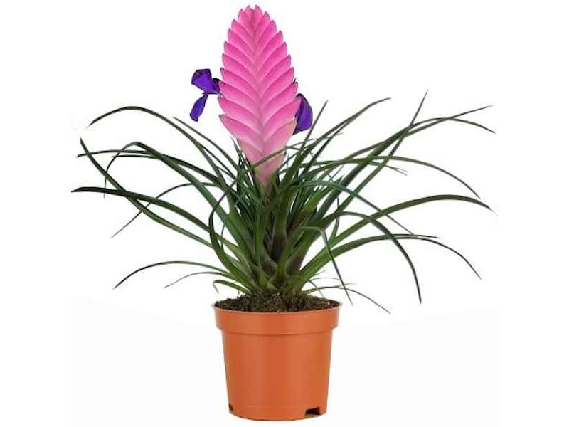 Pink Quill (Tillandsia cyanea-syn. Wallisia cyanea) Plant. An extremely attractive flowering epiphyte that is often found as an ornamental mainly indoors. Botanically, Pink Quill belongs to the Bromeliad family (Bromeliaceae), and is native to the tropical forests of Ecuador. It is a small species, which can reach a height of up to 50 cm. It is a perennial, evergreen plant with a dense crown. The leaves, which are arranged in rosettes, are glossy, arcuate-arch, oblong-lanceolate and dark green in colour, sometimes with a brownish-red base. From the heart of the rosette and absent floral stem, a particularly decorative set of bracts, wing-shaped and pink-violet in colour, grows up to 20 cm long. The bracts can remain on the epiphyte for up to 6 months, from which the true flowers, which are fragrant and have a pansy-shaped corolla consisting of three blue-violet petals, will emerge in summer. Each flower lasts from 1 to 3 days and the flowering period lasts from 1 to 3 months. Pink Quill - although an epiphyte and air plant- is perfectly adapted to growing in a pot. For its smooth growth, the foliage can be sprayed or the pot can be watered to add water and nutrients regularly or relatively regularly - depending on the conditions. It should also be placed in positions of indirect exposure to sunlight and/or enhanced shade. In this way it will be able to beautify the environments in which it is placed for years to come.