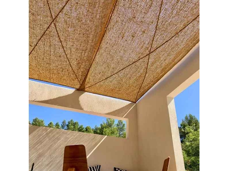 A plain weave patterned sail design. Square or rectangular shade net made of coconut fibres for hanging, with a fixing point at each corner.
